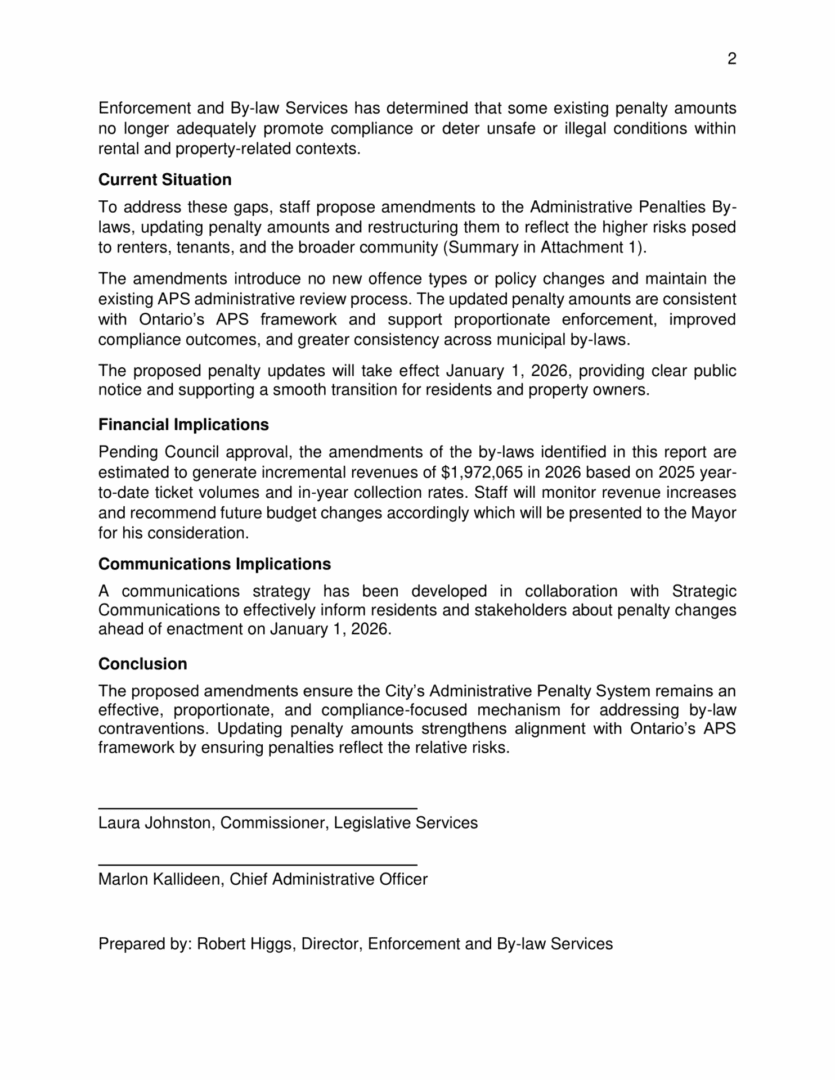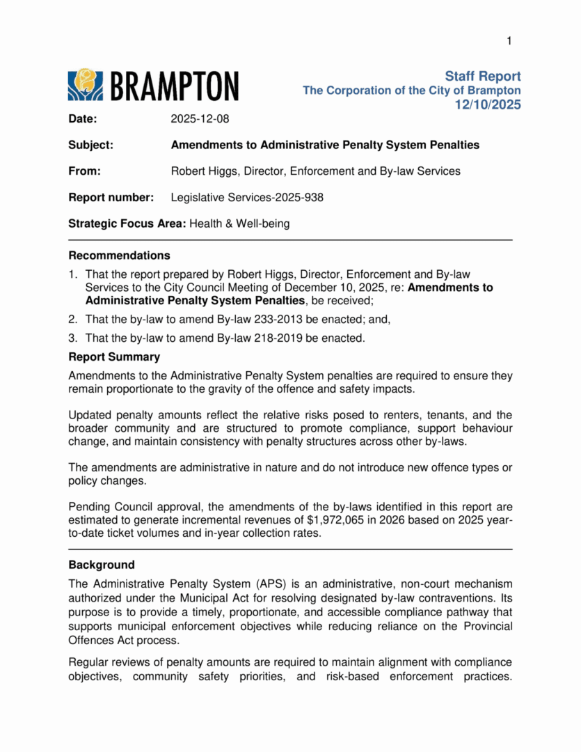 In line with ongoing improvements to the Residential Rental Licensing Pilot (RRL), which will be expanding city-wide, and strengthening bylaw enforcement, the City of Brampton has approved important updates to its Administrative Penalty System (APS) to increase penalties that are more aligned with the City’s ongoing commitment to community safety and enforcing repeat and egregious offenders. These changes apply to both parking and non-parking by-laws, to help better address safety risks, recurrent violations, and enforcement demands. While the RRL has successfully brought more compliance, these increases in fines and fees are to specifically deal with the worst and persistent violators.