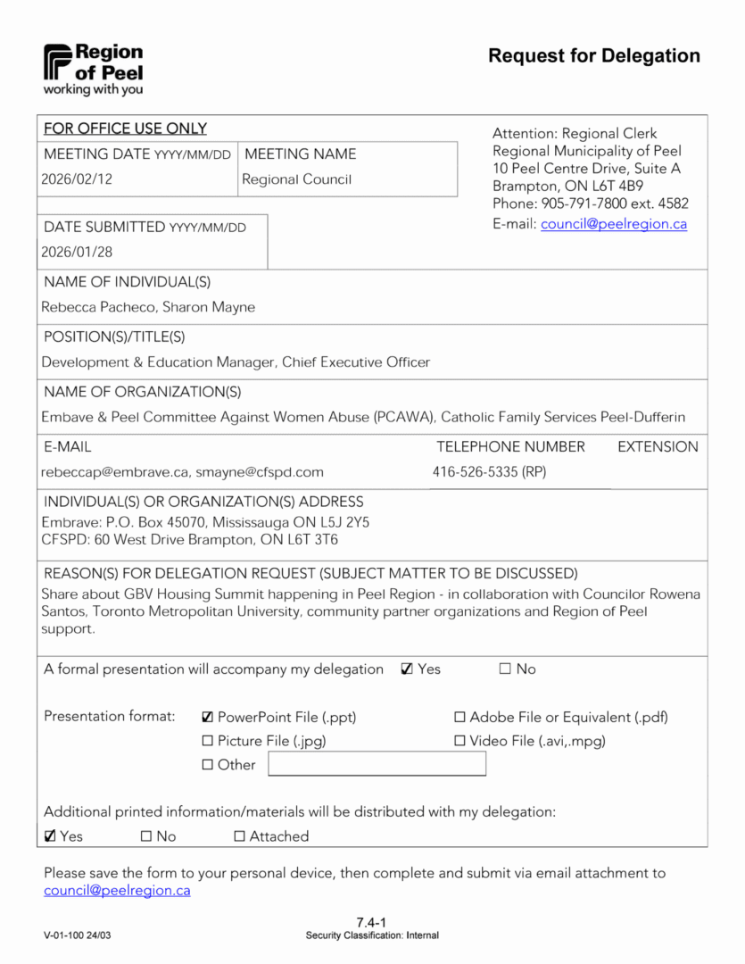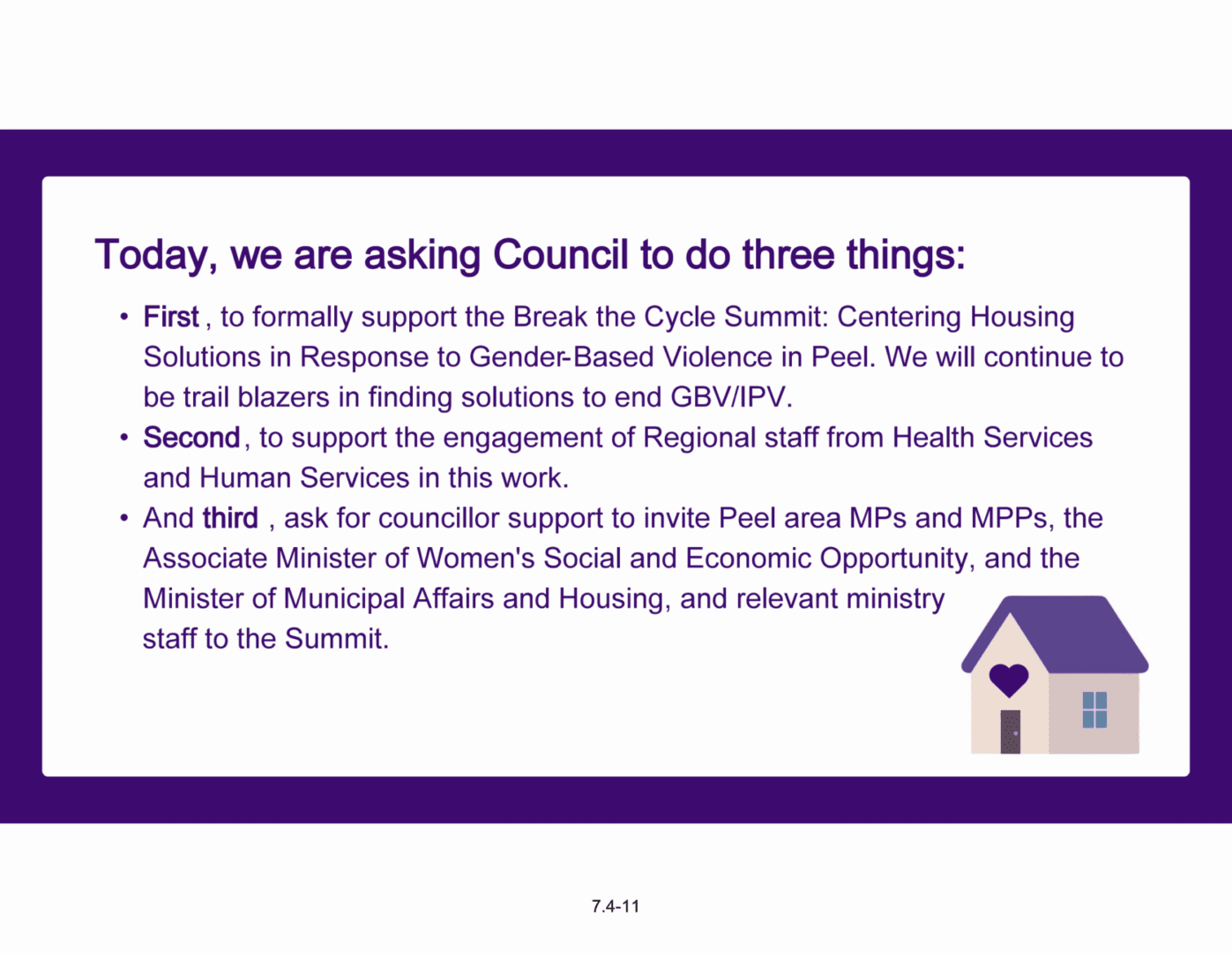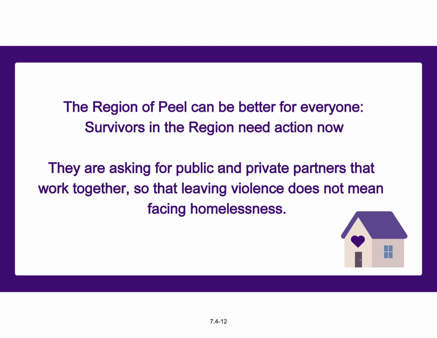 As part of the motion, Regional Council is also being asked to advocate to Peel-area MPs and MPPs for increased investment in housing, shelter, and survivor supports, and to invite municipal, provincial, and federal partners to participate.