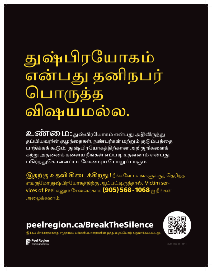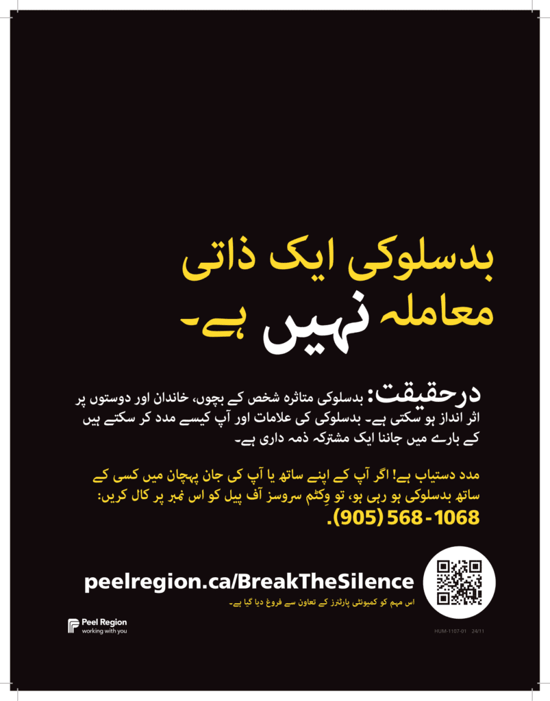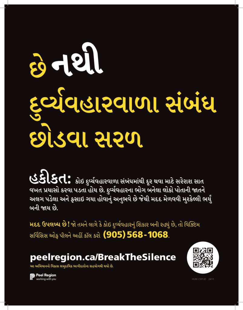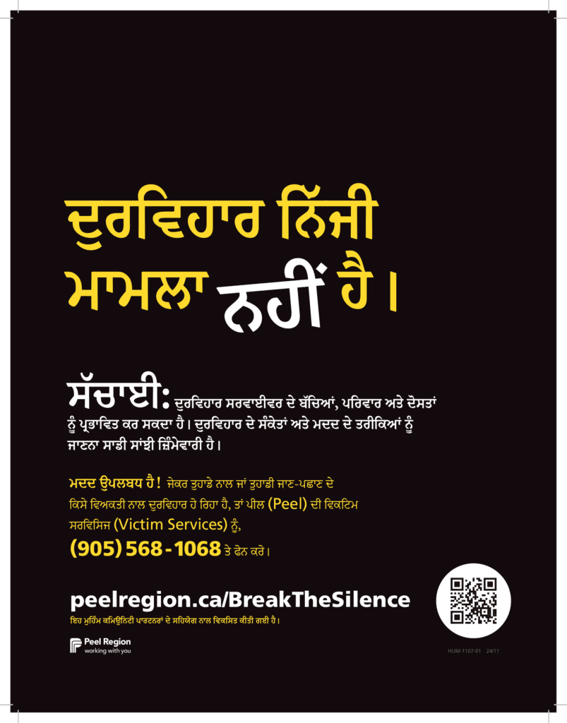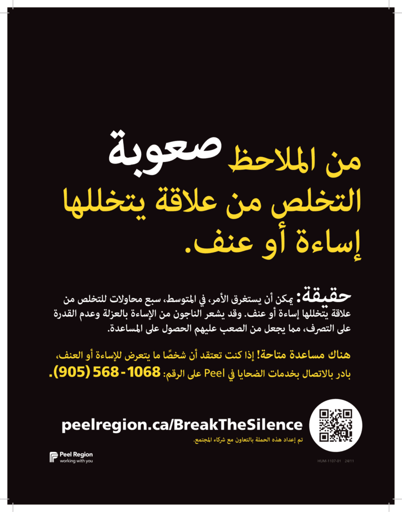 Beginning November 25, 2024, on the International Day for the Elimination of Violence Against Women and throughout the 16 Days of Activism Against Gender-Based Violence, Peel Region and its partners are launching the annual Break the Silence campaign. This initiative encourages residents to talk about family and intimate partner violence in our community. Now in its fifth year, the awareness campaign aims to challenge misconceptions about family and intimate partner violence while ensuring survivors know there is help and support available. The campaign will be visible across Peel in both print and digital formats and will include downloadable materials in multiple languages.