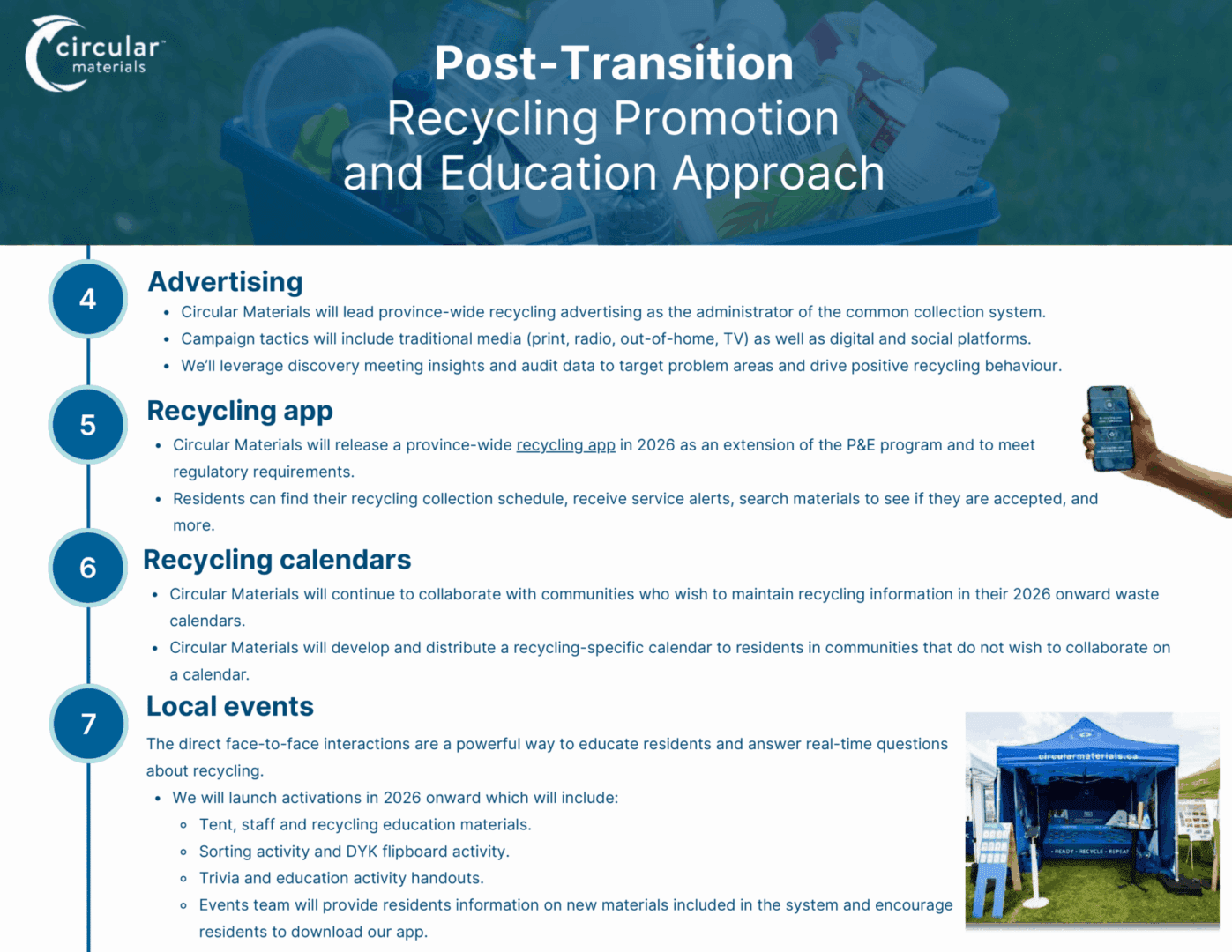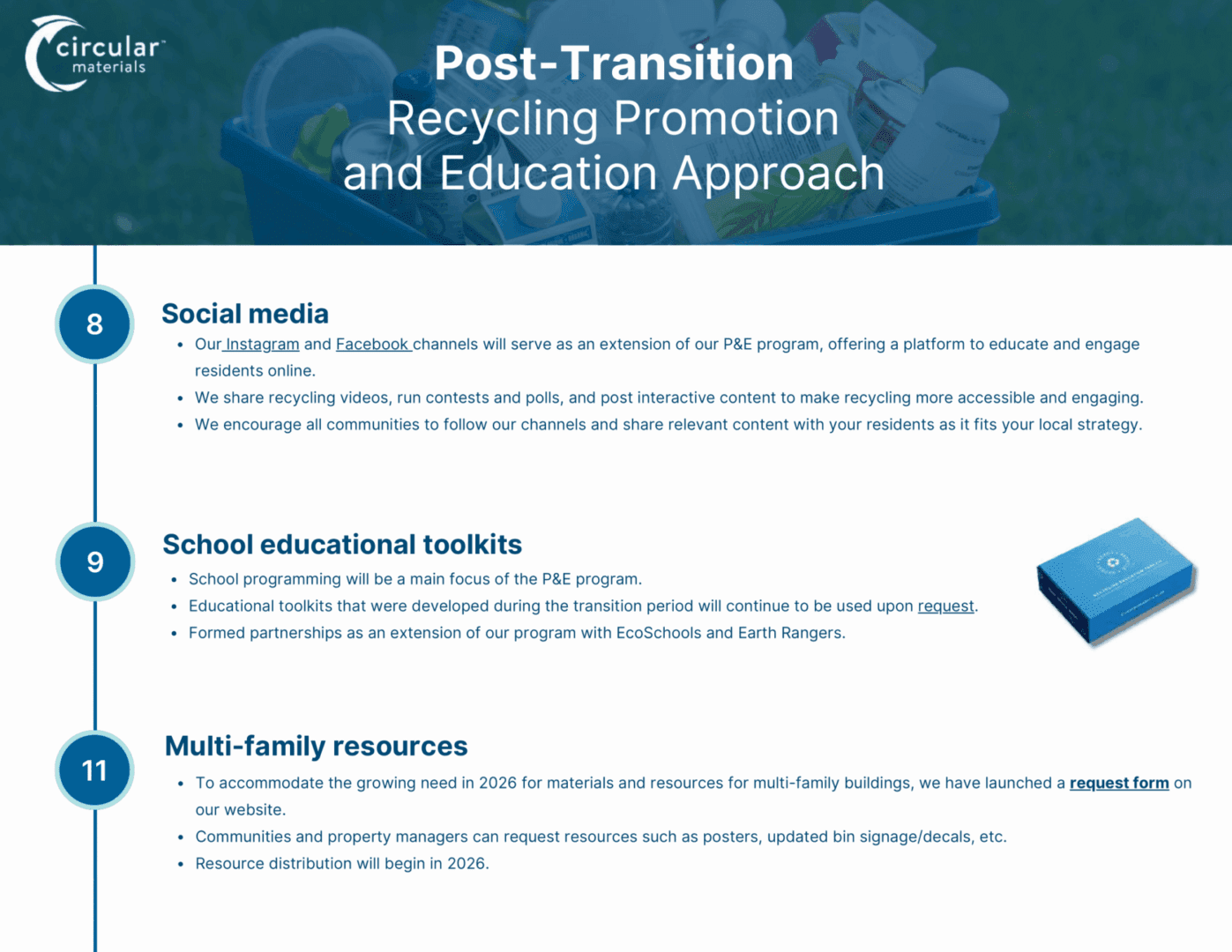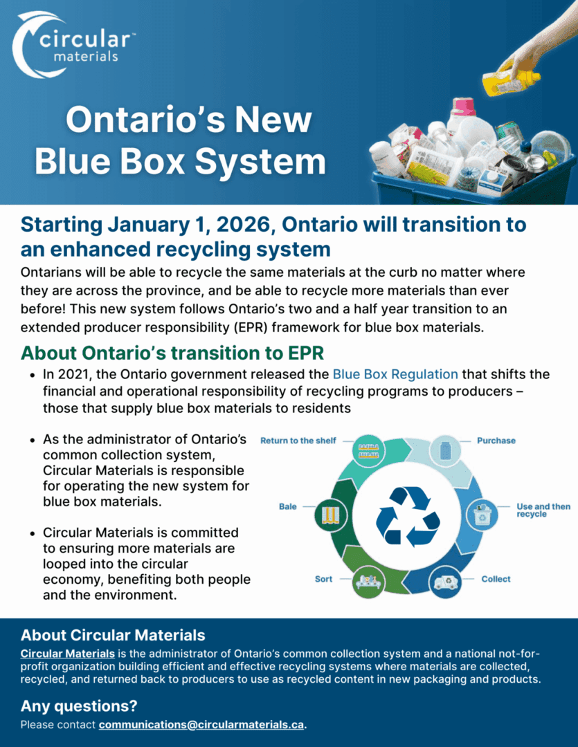 For more information, visit circularmaterials.ca/ON or Ontario’s Blue Box Regulation resources.