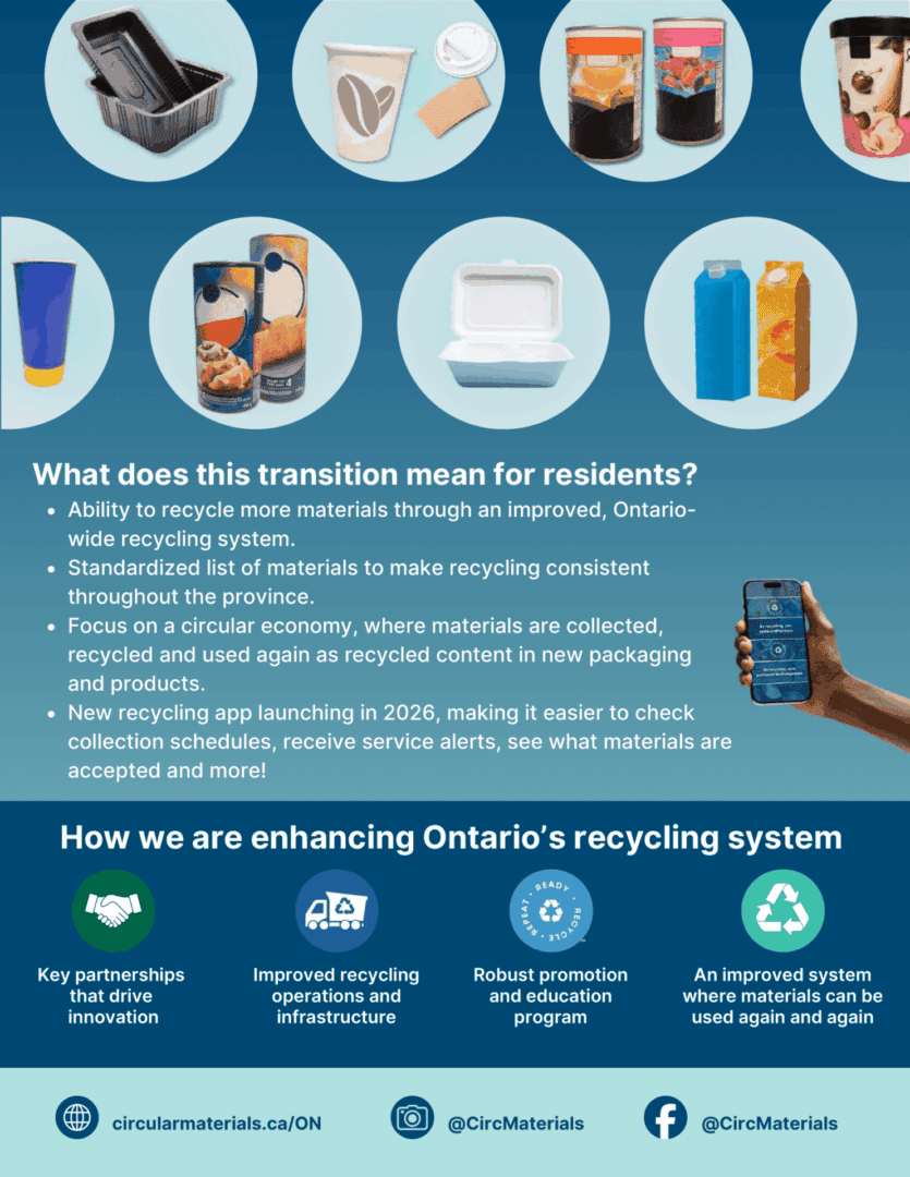 The change follows Ontario’s transition to an Extended Producer Responsibility (EPR) framework, introduced through the Blue Box Regulation in 2021. Under EPR, responsibility for funding and operating recycling programs shifts from municipalities to the producers that supply packaging and paper materials to residents.